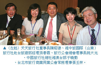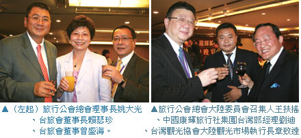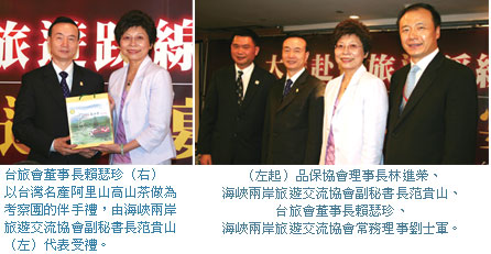 簽訂直航協定後的第一批大陸旅遊業者考察團共38位團員,近日由海峽兩岸旅遊交流協會副秘書長范貴山率領抵台,進行11日的環島考察之旅,首日更由財團法人台灣海峽兩岸觀光旅遊協會做東,宴請此團千里而來的眾家貴賓,晚宴上,也開放具接待陸客來台觀光業務資格的100餘家台灣旅行社代表一同進行餐敘與交流,百多位業者熱切的互動更是讓會場氣氛熱烈非凡。