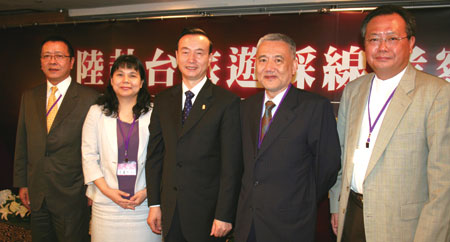 ▲(左起)台旅會董事曾盛海、行政院大陸委員會經濟處副處長李麗珍、海峽兩岸旅遊交流協會副秘書長范貴山、台旅會董事莊秀石、財團法人海峽交流基金會旅行服務處處長劉克鑫。