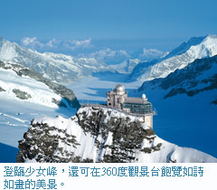 來到瑞士中部,必定不能錯過琉森湖區及登上著名的少女峰。據傳這是昔日修道士經過時,讚嘆其高聳險峻的關係,驚呼其為「處女峰」,以示其地勢高聳及難以登臨的聖潔。而今,隨著科技的蓬勃發展,登上少女峰不需再像以往那樣長途跋涉。王貽增表示,登臨少女峰第一件事,就是搭乘挨著一格一格台階上山的齒輪列車,並且再轉搭瑞士少女峰(Jungfrau Railways)鐵道,經過一連串漆黑的隧道以後,一出隧道隨即是就是一片壯闊、雪白、潔淨且懾人的美景。