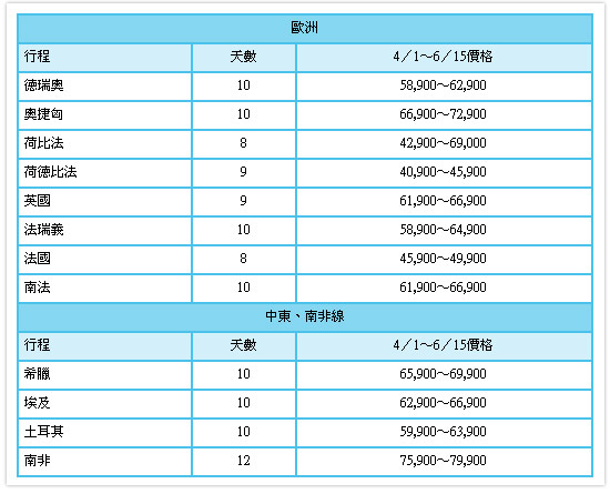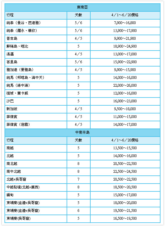 4、以上報價由台北出發,高雄出境之旅客僅供參考。