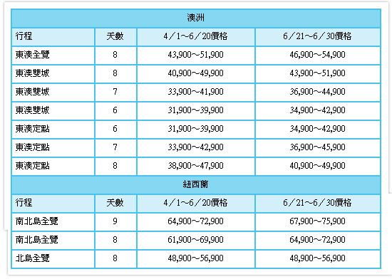 在紐澳地區,鳳凰旅行社旅遊事業部副總黃賢在表示,「由於長榮航空自今年3月底台北-雪梨停飛,全年度將減少1萬個機位左右,將造成一定影響;紐西蘭方面,由於紐西蘭航空自3月下旬台北-奧克蘭停飛,機位也減少了。而目前進入紐西蘭北島旅遊適宜季節,買氣將會漸入佳境。澳洲市場在去年終於有成長,希望今年同業持續推出優質行程。」目前澳洲地區流行定點旅遊,各旅行社可依照航空公司包裝雪梨、黃金海岸、墨爾本、凱恩斯等定點旅遊。整體而言,4~6月份這一季是紐澳的秋冬季節,行程安排將以賞雪、泡湯為主。