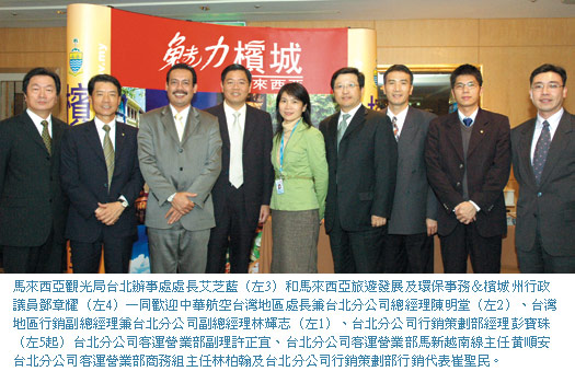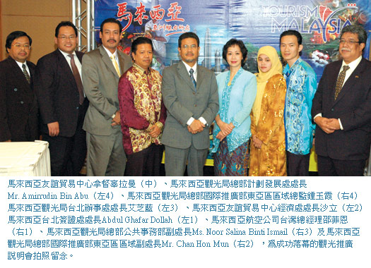同時,馬來西亞觀光局台北辦事處處長艾芝藍也表示,「馬來西亞觀光局致力發展觀光,重視各市場的不同需求,因此每年定期至各地考察,希望能更了解當地旅遊文化,進而推動大馬觀光。今年,即將榮升馬來西亞觀光局總部國際發展部總監的Mr. Amirrudin Bin Abu,特地來台考察,計劃在台北、新竹、台中及高雄針對旅行業者舉辦觀光說明會,並和新竹科學園區及台中工商業先進們會面交流,說明馬來西亞工商會議及獎勵旅遊的優勢,讓台灣民眾認識更全面性的馬來西亞觀光風貌。」