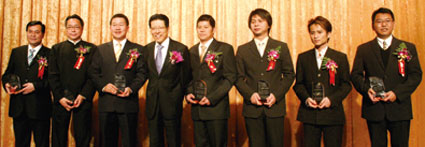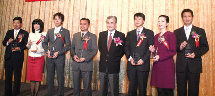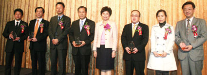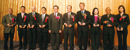 ▲ 台灣觀光協會名譽會長暨台北國際旅展主任委員嚴長壽(左4)頒發感謝牌表揚熱心參與2008國際觀光推廣活動的單位,(左起)台北福華大飯店、涵碧樓大飯店、亞都麗緻旅館系統、台灣休閒農業發展協會、六福村主題遊樂園、真愛婚禮有限公司、維格餅家有限公司。