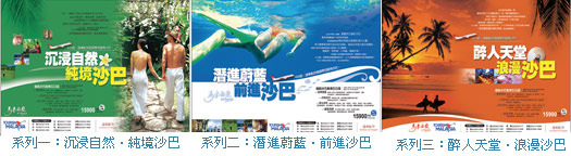 廣告切入面以「純淨氛圍、海洋情懷、浪漫美景、自然生態、風味料理」等5項沙巴最為人所熱愛的主題為主軸,於標題表現均引導至整體的沙巴概念,因此在視覺呈現上,均能延續統合調性,再加上文字敘述「請調整好最優閒放鬆的度假姿態,準備潛入美麗且驚艷的海洋世界、享受最純樸原始的自然祕境、再來一道暢快香辣的異國料理…,一段繽紛歡娛的精彩旅程,就從遠航開始!」進而將沙巴迷人的萬種風情,深植人心。