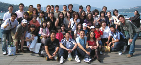 聯翔國際旅行社年度春酒及員工旅遊前往東埔溫泉,總經理黃財欽(最後排左1)、經理林國祥(最後排左2)、總經理何永祥(林國祥前、著黑衣者)、經理趙禮敦(圖右側著藍黑上衣、白布鞋、蹲下者)、副理黃建文(圖左、豎起拇指者)也參加,與員工們齊聚展現向心力。
