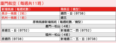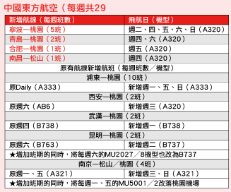 上海—松山從原來每週5班增為7班,每天飛航,並新增天津、南京—桃園各為每週2班及1班。