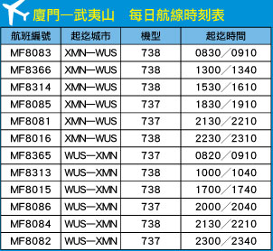 隨著大陸知名導演張藝謀的新作「印象大紅袍」,即將於3╱2正式開演,向全世界介紹武夷山美景並詮釋當地特有的「山水茶」文化,廈門航空也將從3╱5起增加廈門—武夷山航線的航班密度,以每天6班服務想要前往武夷山的旅客,並從6月起增加至每2小時1個往返航班(每天8班);2011年起每1小時1個往返航班,全面構建空中旅遊快線。