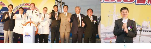 1.(右起)基隆市市長張通榮、港務局長王俊友、市議會議長黃景泰、麗星郵輪台灣區總經理盧冠群,以及天秤星號船長(左3)率領幹部一同轉動船舵,歡喜慶開航。