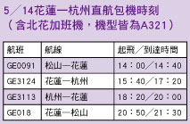 復興航空繼2008╱7╱4花蓮首航廣州後,自今年5月起花蓮出發之直航包機將再度啟航,目前已確定之航班為5╱14花蓮—杭州1個來回航班,另外目前正在申請的航班為6╱8、15花蓮—武漢,及6╱18、25花蓮—杭州共4個來回航班。