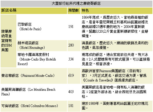 同時,旅遊與會議管理局副局長Jean-Jose Bertani,也同步推出摩納哥觀光護照(Passport for Monte-Carlo),凡選擇入住此次合作的6家飯店(見表一),即可獲得護照好禮,總值250歐元!12人以下的團體參加本案,隨即贈送機場來回直升機各一次及價值50~80歐元的博物館入場門票。