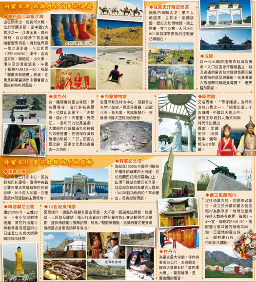 內、外蒙行程「由內至外」是較為理想的安排,旅客初見內蒙風情、沙漠駱駝是喜悅,漸次由帝國歷史演進遞增至召廟文化了解蒙古族與藏傳佛教淵源,到震懾天地相連的外蒙大草原、入住獨特的蒙古包、品嚐蒙式羊肉大餐的道地體驗,賓主盡歡。