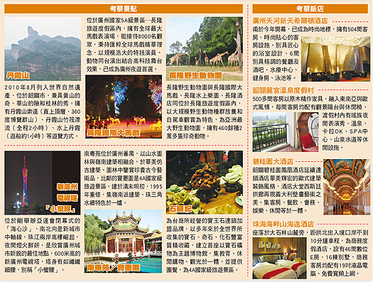華航台北分公司客運營業部香港.大陸線主任魏怡卿指出,中華航空「最愛香港PAK」,從純港產品開始,以一程多站概念延伸出港澳自由行、港圳雙城記4日產品,過去市場上多集中在粵南行程,為了開創新局,此次前進粵北考察,發掘了與粵南截然不同的旅遊亮點,包括世界自然遺產─丹霞山、溫泉等,資源相當豐富,未來將結合韶關、廣州、珠海、深圳、澳門等地,串起珠三角遊覽新路線,交通上採用港廣或港港進出航班,及策略運用武廣高鐵(廣州─韶關僅45分鐘)、港澳噴射飛船等便捷接駁,與業者包裝新產品。在粵南部分,此次亦考察當地近年竄起相當火紅的景區,包括最受到小孩喜愛的長隆國際大馬戲、長隆野生動物園等,為此也籌畫推出以親子同遊為方向的產品。
