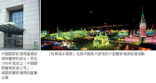 針對海內外體育旅遊,中國推出兩大類旅遊產品:一是各地具有代表性的大型體育健身旅遊活動,共有60項內容,包括哈爾濱冰雪節、北京萬人登長城比賽等等;另一類是專項體育旅遊產品與線路,共有12大類、80個專項,包括環青海湖自行車挑戰賽、絲綢路的沙漠探險,以及北京、上海、大連、桂林等地的高爾夫休閒運動等等。