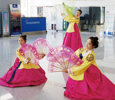 ▲ 長白山首發團反應熱烈,120餘人於長白山機場欣賞迎賓舞蹈。