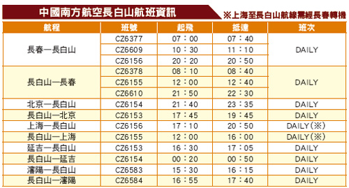 長白山區唯一的機場在2008年用之後,大大縮短了到長白山旅遊的時間。目前長白山航線由南方航空經營,已陸續開通至延吉、長春、北京、上海、瀋陽等5條航線,每天皆有6個航班運行。未來在長白山國際度假區的建設陸續完工後,航空班機的運量勢必無法滿足市場需求,屆時將增加更多的航班,也讓旅客在安排旅遊時更加便利。