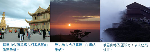 峨眉山近幾年以金頂變化最大,中山區也新增了清音平湖景點,明年更將從此區興建一條索道連至猴區,讓旅客能夠輕鬆遊覽。峨眉山景區管委會副主任馮慶川指出,「近年來峨眉山以『雲上金頂,天下峨眉』為宣傳主軸,海外市場比去年同期成長了100%,但台灣旅客到峨眉地區旅遊上金頂的卻僅有50%。因此,未來將與同業合作,多多推薦旅客們上金頂。」