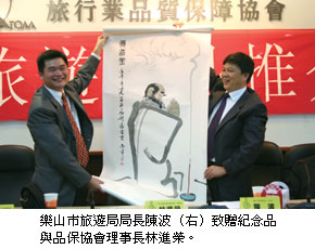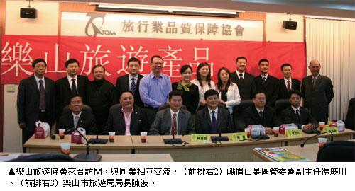 (左起)本刊社長何昭璋、品保協會理事長林進榮、樂山市旅遊局局長陳波、彰化縣觀光協會理事長王永欽。品保協會理事長林進榮表示,由於台灣旅遊同業與樂山市旅遊局的長期努力與合作,大陸四川的旅遊產品相當豐富,遊程操作亦相當純熟,特別是前往成都的包機,可以說是班班客滿,樂觀預計2007年前往四川旅客將會有30%以上的成長率。