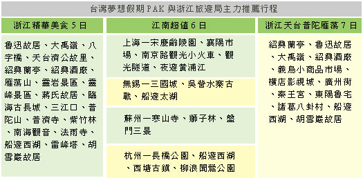 目前計畫投入800億人民幣,建置數百個各有其風格的旅遊項目,預計在2007年前完成,放眼未來,台浙將更有整合旅遊產品的資源。