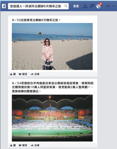 許淑玲等一行人的台灣代表團透過瀋陽、丹東進入平壤,並參觀了萬壽台大紀念碑、祖國解放戰爭勝利紀念館、北朝鮮油畫藝廊,並於平壤市大同江上的羊角島飯店參加「北朝鮮國旅成立60週年」產品說明會與晚宴,除了受到北朝鮮旅遊總局副局長趙成奎的款待外,更於體育館欣賞知名的《十萬人阿里郎》表演,上萬人整齊劃一的動作,展現了北朝鮮人團結一心的凝聚力。