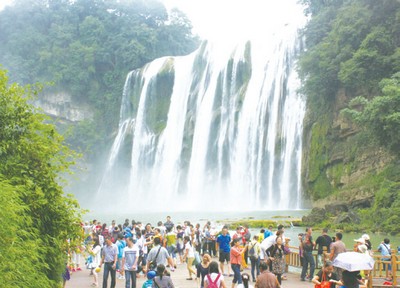 海拔600~1,500米的鎮寧、關嶺布依族、苗族自治縣的交界處,風光秀麗、奇峰疊起,浩浩蕩蕩的白水河驟然間由斷崖上跌落,形成九級瀑布,黃果樹瀑布便是這些瀑布群中最壯美的一個。其高74米、寬81米,漲水時節如蛟龍翻騰、浪花飛濺、水珠飛揚,枯水時節則猶如萬縷銀絲披掛、輕柔多姿,又是另一種獨特的景致。在黃果樹瀑布的水簾背後隱匿著一條百米長的水簾洞,洞內除了千奇百怪的鐘乳石外,還有洞廳、洞窗和洞泉,真是暗藏天寶精華之地。其中的摸瀑台向外伸展數米,站在摸瀑台的前端伸手及可摸到瀑布飛流而下的瀑簾,震天的響聲讓人感覺到大地都在隨著瀑布的脈搏震動。瀑布下的犀牛潭則可讓人踩入水中,從瀑布下端的最近距離感覺這大自然的神奇,驚歎這鬼斧神工般的黃果樹。