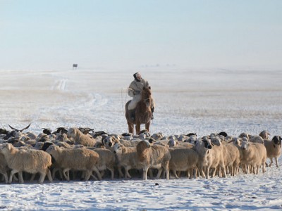 ▲ 大草原上的羊群放牧表演,在一望無際的大雪原中別具意境。