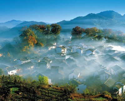 江西婺源被世人稱之為「中國最美的鄉村」,每年的三、四月份,是婺源油菜花登場的時節,漫山遍野的油菜花綻放是一年中最美的時光。錯落的花田間,可看見帶有溫淳氣味的古宅,隱現於蔥鬱的林木之中、座落於秀美的峽谷之地,或靜立在潺潺的溪水之畔,融為一體。