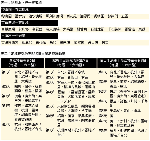 近來,在浙江旅遊局與台灣旅遊業者的同心推動下,重新調整浙江單點或雙點的參訪模式,包裝的特色景區中,將大禹嶺、夜遊紹興環城河、諸葛八卦村納入開發的項目,同時在歷史文化與絕美風景上予浙江另一包裝面向,由金鷹、全球運通、行家、良品、飛龍、祥華、開新、新瑞 鴻慶、華泰、行遍天下等11家旅遊同業組成的「夢想假期」在年底發動戰線,全面拓展浙江在台灣的能見度,拉抬旅浙人次。