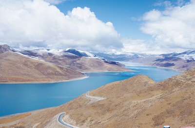 ▲羊卓雍措的湖水來自念青唐古拉山脈的雪水,隨著陽光角度的不同,湖水會顯現出層次相當豐富的藍。因為湖盆為不規則形狀,而且湖岸線長達250公里,在每個角度,都無法將羊卓雍措盡收眼底。