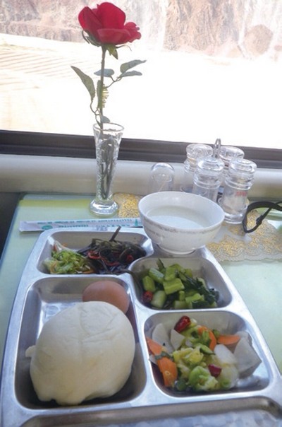 ▲列車上設有餐車,提供早午晚餐,遊客上車後可自費購買早餐,體驗在青藏鐵路上用餐的感覺。