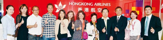 ▲(左起)香港航空台灣分公司銷售部代表吳恬如、逸歡旅遊總經理駱祉宏、董事總經理陳丕展、順怡旅遊董事總經理劉玉鵬、可樂旅遊產品三部港澳線協理廖靜慧、易遊網資深經理陳秋如、可樂旅遊票務部總經理李寶秀、鳳凰旅行社董事長張金明與夫人吳明雪、澳門旅遊局公關顧問林鴻祥、香港航空台灣分公司銷售部代表王嘉玲、總經理李海青。