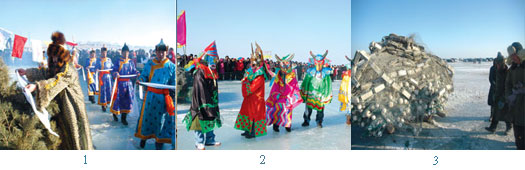 1.主祭官祭敖包。 2.傳統舞蹈巡行會場。 4.置放捕撈魚具。