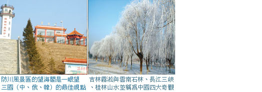 配合策畫行程的吉林市縱橫旅行社總經理曹玉君亦表示,吉林省的旅遊優勢很大部分在自然方面,尤其是吉林「霧淞」,也稱「樹掛」,是霧中的水粒子在樹枝上凝結積聚而成,放眼遠望,好似冬季的枝木上,都長出雪白的花朵般,甚者,此奇觀更與雲南石林、長江三峽、桂林山水並稱為中國四大奇觀。