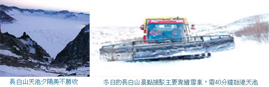 廣義而言,長白山是指中國東北部和朝鮮北部高地的總稱,古有「藏天然之秘、蘊萬古之靈」美名,而上千公里的長白山脈,橫亙於吉林、遼寧、黑龍江三省的東部,目前以俄羅斯和朝鮮的遊客居多,山上的溫泉旅店也多是韓國人來此興建投資,且長白山涵蓋溫帶到寒帶不同的景色,一年四季至此都有不同的體驗。據了解,長白山是座休眠火山,曾有過3次噴發的紀錄,熱能與地熱通常是拿來開發當地著名的溫泉設備的方式使用。進入冬季後,交通接駁問題的重任就由大型履帶鏟雪車進行,載送遊客到小天池、天池、長白山瀑布…等景點。依此,吉林市縱橫旅行社國內部經理方明表示,「以往夏季才是長白山的旺季,但在吉林冬季旅遊持續的推廣後,冬遊的市場也正慢慢拓開中,並且長白山在華人觀光視野中並不陌生,透過長期推廣的宣傳模式,帶動出的人次潛力時不容小覷。」他提到,「景區內最著名的天池位於終年積雪的火山錐中,由景區入口接駁至此約需要40分鐘,其北面池水終年向外流敞落下就成了長白瀑布,而小天池又稱為銀環湖,因從峰頂俯視下恰似銀環得名,分為東西二湖面,與周邊林海落映,更現出碧波蕩漾的美景。」