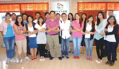 ▲(前排左起)上林笑林旅遊公司韋艷紅、南寧市旅遊發展委員會市場促進科李粵玲、桂林招商國際旅行社南寧分公司經理吳彥儀、喜鴻旅行社大陸線線控李佳俞、南寧市旅遊發展委員會市場促進科科長李寧、雄峰旅行社總經理施懿、西南愛旅遊旅行社業務經理趙品嫻、山富旅遊陳虹如、行家旅遊企劃部OP施佩岑、五福旅遊企劃部楊詠婕;(後排左起)德天旅遊總經理葉杰賢、南寧水城旅遊業務主管李志堅、南方航空廣西分公司市場銷售部副主任鍾璠、華泰旅行社團體部副理鄭昌逸、雄獅旅遊大陸港澳部線控李建霖、青秀山風景區旅遊經濟發展局副局長夏發娥、大明山管委會旅遊科李潔、德天旅遊經理唐軍。