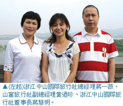 中山國際旅行社總經理蔣一薇表示,「浙江省重視工業與旅遊發展,其中旅遊發展又是浙江省旅遊近年來極力推展的無煙囪工業,在旅遊業一致 看好的情況下,台灣旅遊業者交出反應最快、也是最好的成績。」蔣一薇以數據指出,「2006年入境江南的人次有56萬人,台灣旅客就占了30多萬,其中以旅遊為目的的人次就有16萬。」對於市場反應迅速的台灣業者,蔣一薇表示高度肯定,當然中山國旅也不以現況為滿足,今年在各人民政府與旅遊局的努力之下,高速公路皆已陸續開通,達成杭州至各旅遊地區2小時以內到達的規劃,完成輻射狀的旅遊網絡,甚至鄉鎮與鄉鎮的交通時間也在2小時內,達到大杭州的旅遊概念;當然交通時間縮短,旅遊品質提升,對於旅遊而言是十足的優勢。
