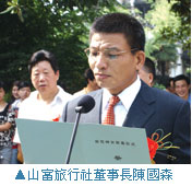 山富旅行社董事長陳國森對於浙江省旅遊局及各地方旅遊局的熱情招待表示感謝,而浙江省旅遊局副局長姚升厚百忙之中,更是兩度探訪,並設宴款待,陳國森更強調,未來山富在旅遊規劃上將竭盡所能,以質量的合理性規劃景區行程,以實際考察行程做為山富力行的工作,將浙江省旅遊市場紮紮實實推薦給台灣民眾,陳國森更指出,2005年以後飛航杭州的航班愈趨增加,目前共有每天共有13航班飛航杭州,足見杭州旅遊市場的發展速度,而山富更將旅遊景點擴大到紹興、諸暨,配合浙江旅遊局規劃的大杭州概念,包裝杭州旅遊產品,進而深度旅遊浙江,陳國森信心滿滿表示,山富有十足擔當將浙江推廣至台灣。