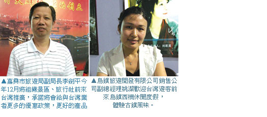 嘉興市的一個重要景區就是烏鎮,烏鎮在過去東柵的觀光型景區基礎上,在今年春節開放了西柵景區,也是此次旅交會上的重點推廣產品。烏鎮旅游開發有限公司銷售公司副總經理姚潔介紹,「烏鎮現在將作為一個旅遊目的地來推,以前台灣遊客通常就在華東線走走,烏鎮只是作為整條路線的一個點。而我們現在希望把烏鎮打造成一個休閒度假的景區,希望台灣遊客可以在烏鎮住下來,在烏鎮休閒體驗。」