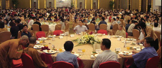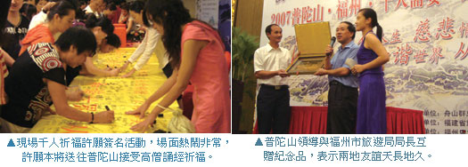 雖然已得到颱風預警,由舟山群島第5屆中國普陀山南海觀音文化節組委會主辦的「2007普陀山—福州千人齋宴」依然如期舉行,舟山市政府、普陀山領導、福州市委常委、市政協,福州市旅行社、企業界等行業代表,社團組織、市民,以及台灣代表共1,200餘人參加了此次活動。
