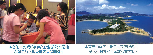近年來,透過不斷開拓市場,以福州市為中心的閩北地區逐漸成為繼傳統閩南地區後一個新興客源市場,今年的到普陀山的進香遊客比2004年同期增加了4倍。為感謝和回報當地百姓對普陀山的厚愛,廣交佛教信眾,同時推介將於今年11月在普陀山舉行的第5屆觀音文化節,進一步開發潛在的旅遊市場,普陀山觀音文化節組委會在「榕城」福州首次舉行了「千人齋宴」,更是勝過前3次的規模,在福州贏得讚譽一片。