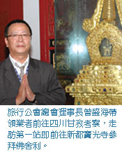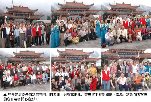 本次考察團為期8天、報名參加人數近150人,是歷來天數最長而規模最大的考察團,多位總會幹部與縣市理事長都抽空參加,曾盛海對此格外感動,他說,舉辦考察的初衷就在於協助業者規劃新的旅遊路線與產品,「因為懂得『推陳出新』對旅業從業人員很重要。」尤其四川東環線九寨溝景區相關產品在台推廣行之有年,業者需要嶄新而具有推廣潛力的路線與產品,此次走訪的西環線,恰可作為同業開闢新四川產品的另一路線。