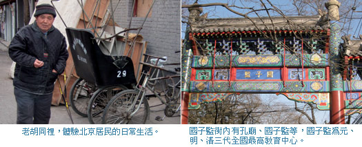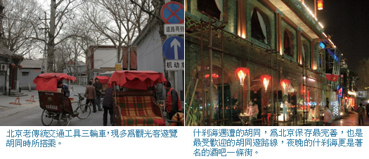 北京遊胡同印證了「內行看門道、外行看熱鬧」,建議初來的旅客不妨參考北京當地旅行社推出的行程,遊覽方式大多以三輪車遊躂一圈,而居民的作息往來、賣黑煤磚的小販吆喝、下廚的菜香,勾勒出胡同型貌,也讓人對胡同大門後的悠宅充滿無限遐想,裡頭似乎存在著另一片北京的天空。
