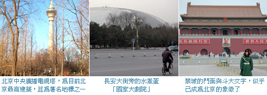 先來看看,所謂北京建築三大奇,其中國家大劇院已經完工、北京中央電視台新大樓(CCTV總部大樓)與北京奧運主賽場,正在趕工建設中,皆預計2008北京奧運前完成。