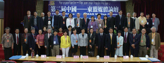 ▲第二屆東盟媒體論壇在西雙版納召開,各國媒體相互交流。前排右6為雲南省副部長鄭明,前排左5為台灣《中國時報》代表楊文山,後排右10為《香港文匯報》副社長韓力。