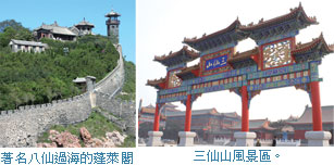 到蓬萊就不能不去看蓬萊閣,蓬萊閣與黃鶴樓、岳陽樓、藤王閣並稱中國四大名樓,目前被列為5A級的景區,在蓬萊閣上有清代書法家鐵保所提的「蓬萊閣」三字大匾,而蓬萊閣是著名八仙過海的起源,八仙就是由此閣飄洋渡海離去,因此有「八仙過海、各顯神通」的名句留下;除了蓬萊閣,在當地更建設有山東蓬萊三仙山風景區、山東蓬萊八仙過海風景區、山東蓬萊海洋極地世界,目前山東蓬萊三仙山風景區正積極籌建中,預估已投入10億人民幣。