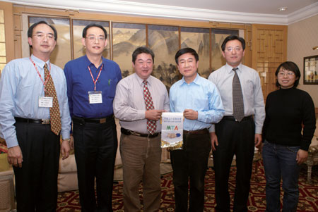▲(左起)甲聯會公共關係組陳仁彬、副會長李謙宏、會長吳志浤共同贈與甲聯會旗幟以表拜會之意。山東省旅遊局副局長王元生(左4)也率旅遊促進與對外聯絡處副處長王榮國(左5)、主任科員林存瑛(左6)共同接受。