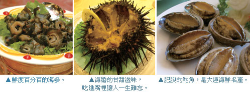大連市因為是港口,海鮮物產極為豐富,盛產魚蝦、鮑魚、刺參、扇貝、紫海膽、螺類等;不凍港的特色更令大連市在海鮮食材上,四季供應無虞,一如台灣基隆港,各式海鮮在大連港幾乎都能找到。其中瀨尿蝦是當地相當著名的一道菜,可用醬料醃漬後生吃。此外,大連的海鮮自助火鍋也因為臨近海港,魚、蝦、貝、蚌樣樣都容易取得,海鮮火鍋料非常豐富。利用海鮮做的湯品、菜餚可說是大連市最重要的美食特色。
