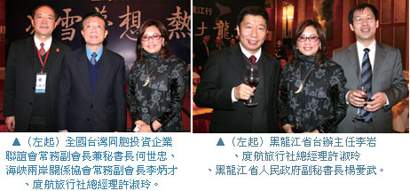 由國務院台灣事務辦公室和黑龍江省人民政府共同舉辦的「台灣同胞2008冰雪龍江行」活動,1月25日於哈爾濱市舉辦,藉此傳遞黑省的特色與投資優勢,推進經貿、文化與旅遊的交流合作,席間也就黑龍江農業合作、哈大齊工業走廊發展、老工業基地振興做完善報告。