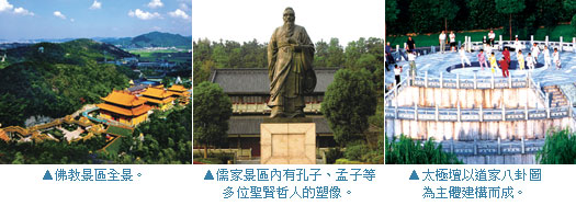 儒家景區內的「杏壇」、「孝心館」與「 論語碑」等景點,以樓、堂、殿、閣、山水長廊,情調高雅,繼承發揚孔子文化的內涵,更典藏與弘揚悠久的儒文化精華,是一處高品位、雅俗咸宜的人文景點。