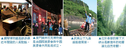 福建省自然風光秀麗,一直有海峽西岸璀璨明珠的美譽,在「山海一體,閩台同根、民俗奇異、宗教多元」的特色中,福建省成為台灣旅客在神州旅遊的人氣區塊,這裡有23個中國4A級旅遊景區,其中武夷山更是世界自然與文化雙遺產的景點,此外還有7座中國優秀旅遊城市,13個國家重點風景名勝區,此次考察的景點項目包含有奧林匹克博物館、武夷山、寨下大峽谷、九龍湖、永定土樓、南靖土樓、閩台緣博物館、廈門園博園等,相當豐富的景點安排,讓考察的眾家旅遊業者大呼過癮。