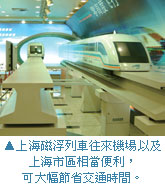 華航台北分公司客運營業部商務組主任陳怡君表示,為便利往返上海的旅客,無論是聯程票或是包機航班,購票即贈送上海磁浮列車由機場至龍陽站間的來回車票,車程僅需不到8分鐘便可抵達龍陽站,旅客若開車則需要1個多小時,可省下相當多的交通時間。上海磁浮列車不僅速度快,更擁有15分鐘1班的密集班次,而龍陽站位於上海市中心,並與市內輕軌列車連結,轉往其他運輸系統也都相當方便,她指出目前旅客大多較習慣自行安排接送,其實利用磁浮列車可說是便利又經濟實惠的選擇,也建議同業多多推薦予旅客。